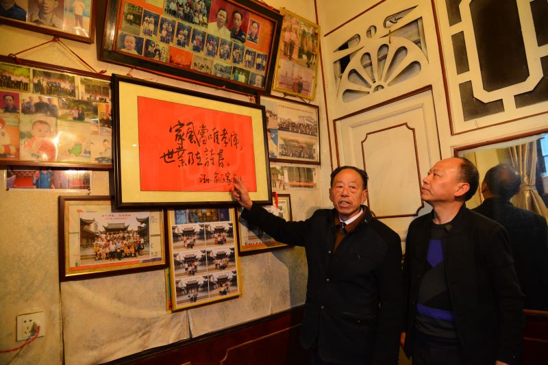 婺源县江湾镇汪口村八旬老人俞广攀向儿子俞友鸿讲解“微家训”。俞老做了一辈子裁缝,不挂广告挂家训,培养了国家级非遗代表性传承人俞友鸿。新华网发(程新德 摄)
